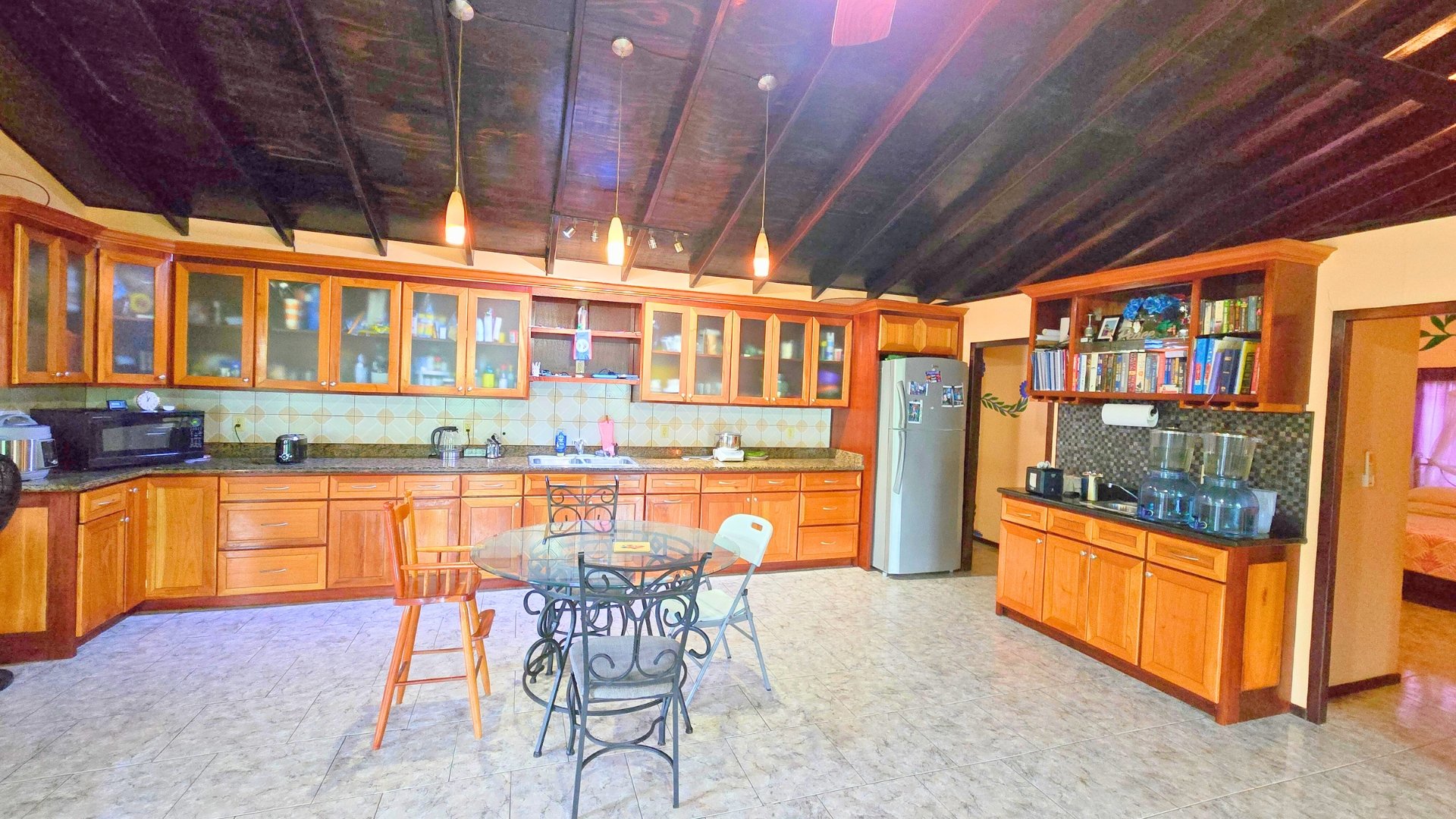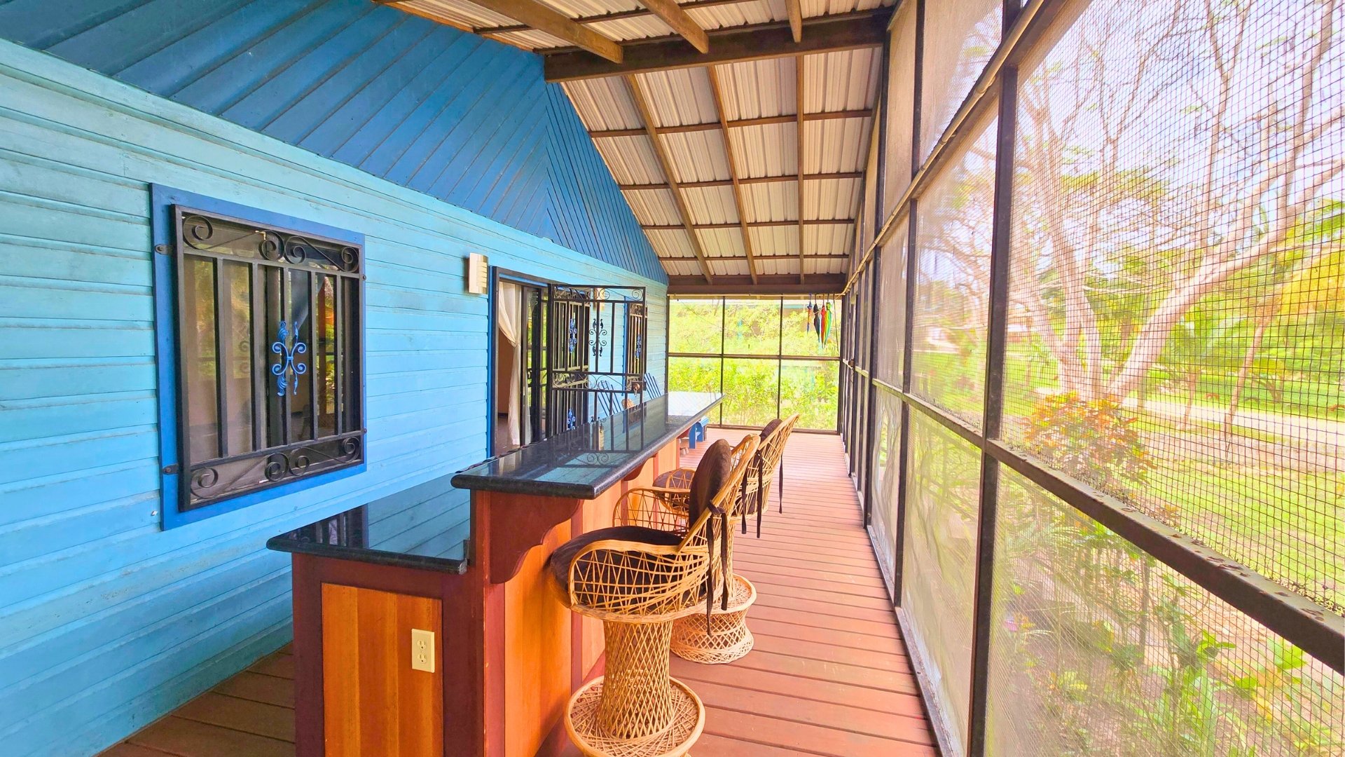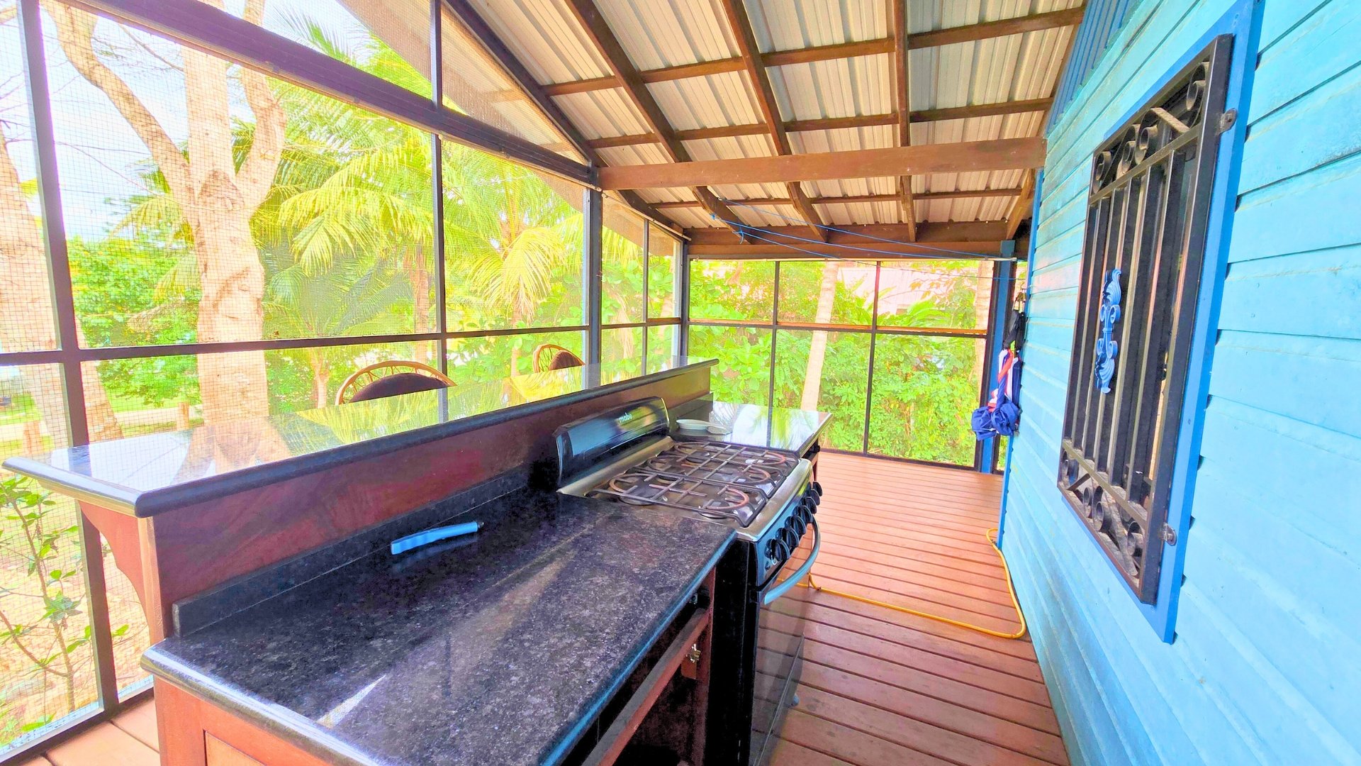The home features an open-concept living, kitchen, and dining area with a beautiful cathedral ceiling. This creates an open, airy feel. The kitchen features hardwood cabinetry with ample storage. The current owners have created a fun tropical cooking setup by using the large granite-top island with a stove on the screened verandah. This is perfect for enjoying the Belizean climate while you cook and entertain. A large A/C unit cools the main living area when needed.