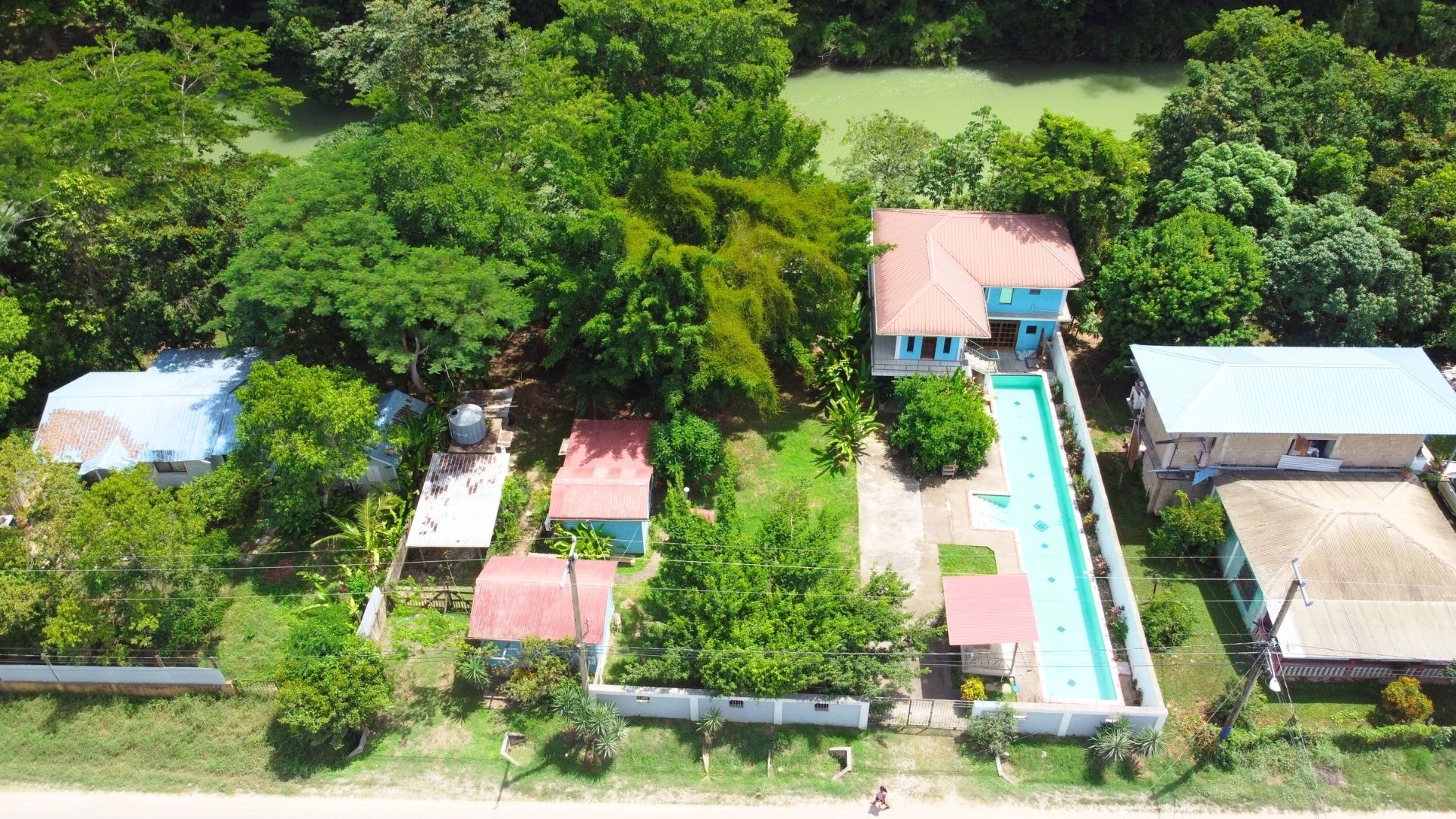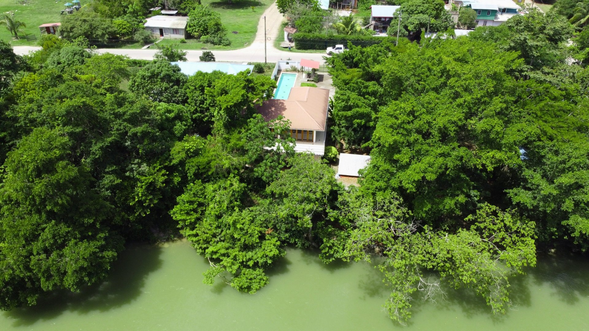 Six buildings, including five residences and a guest bathroom, sit on a large, 0.30-acre lot along the tranquil Mopan River.