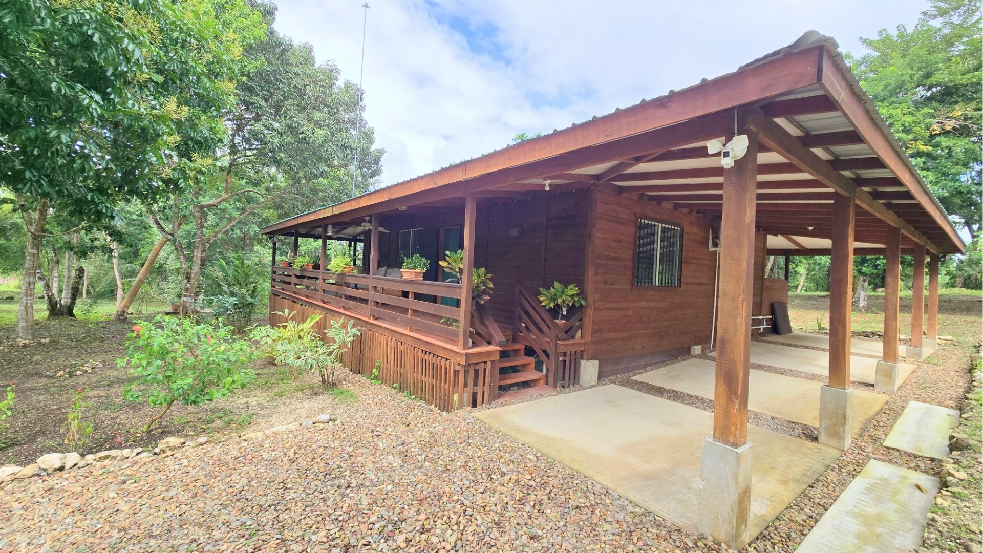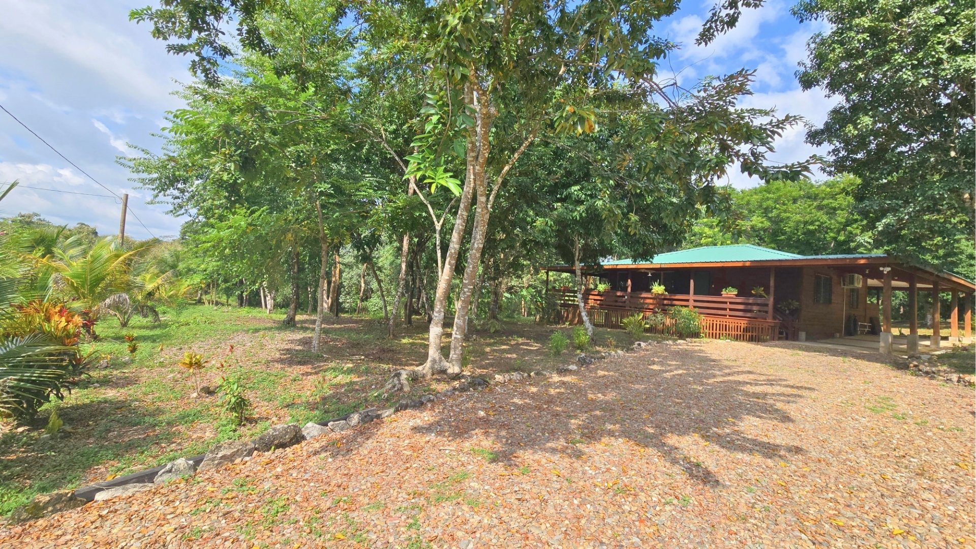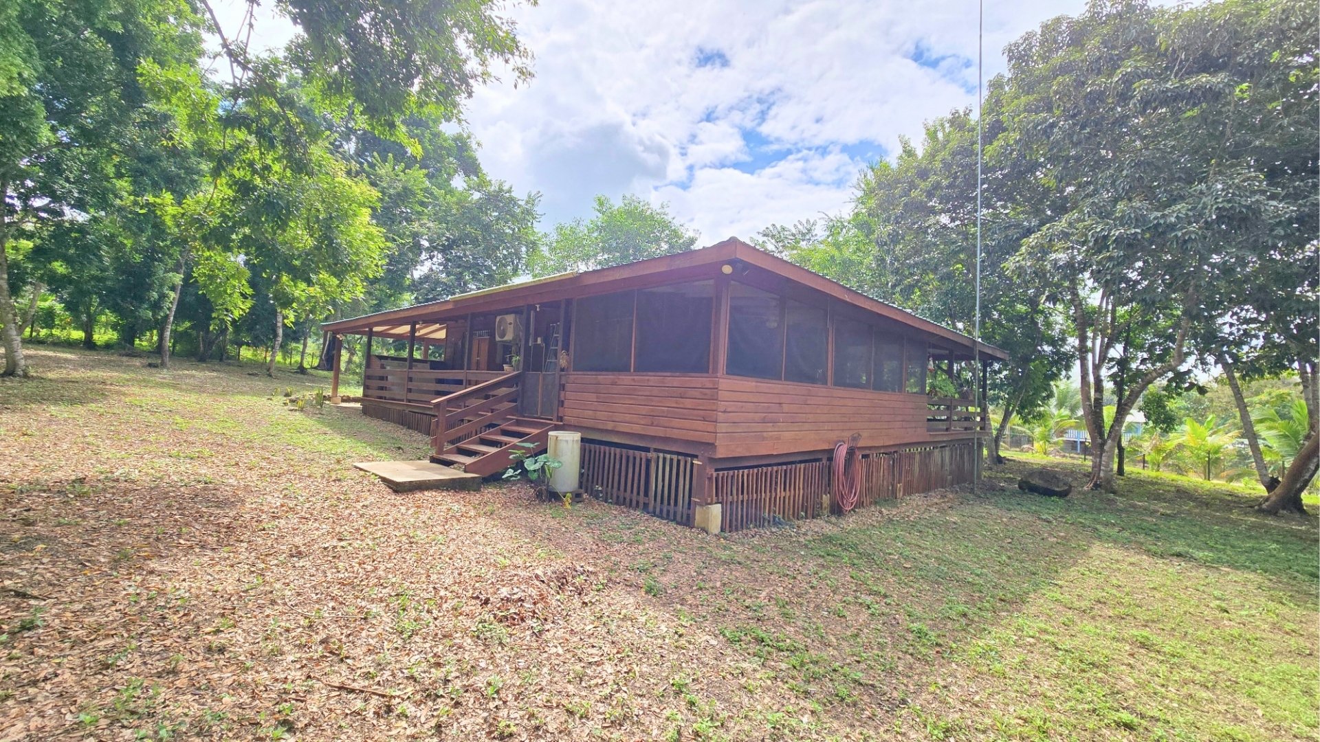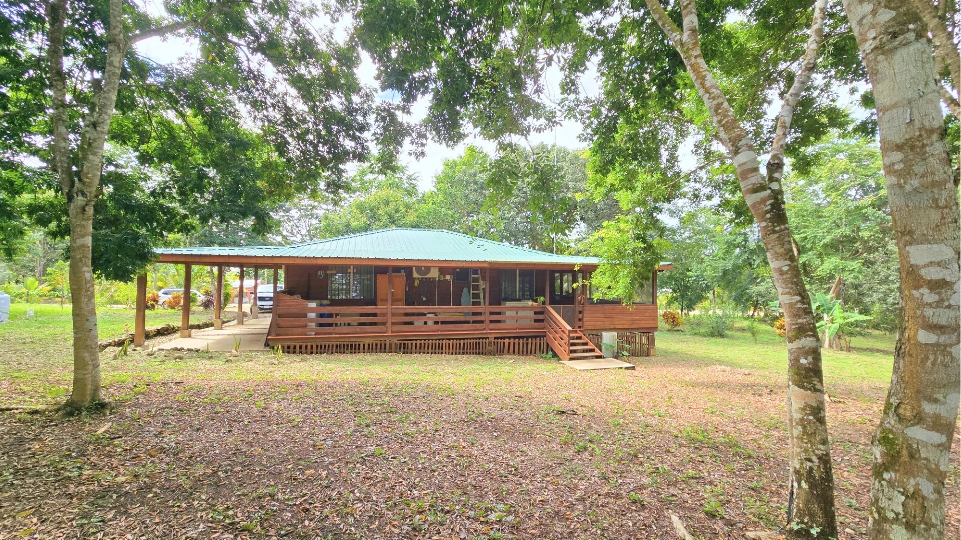 The land totals 7.5 acres, with 4 acres cleared and landscaped, featuring fruit trees including avocado, plantains, bananas, surnam cherry and more. The remaining 3.5 acres of jungle, with trails and a small hill, are ideal for future development of cabins, a retreat, or rental cottages.