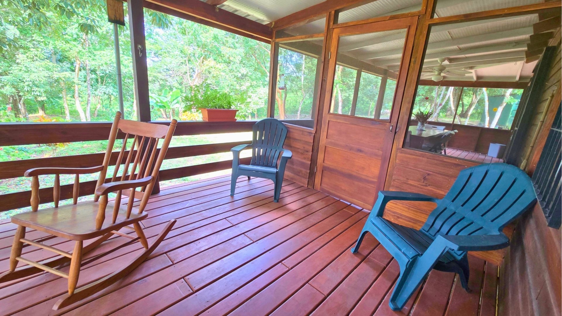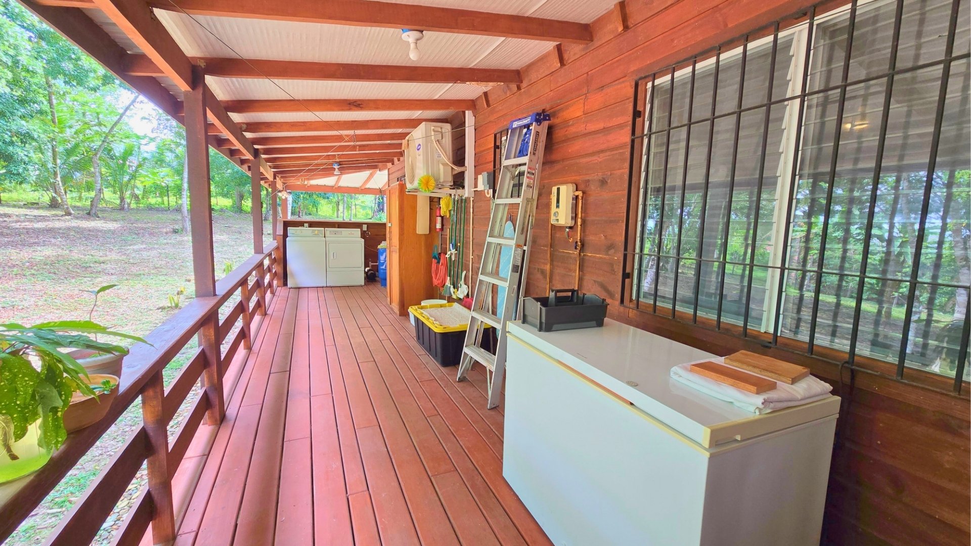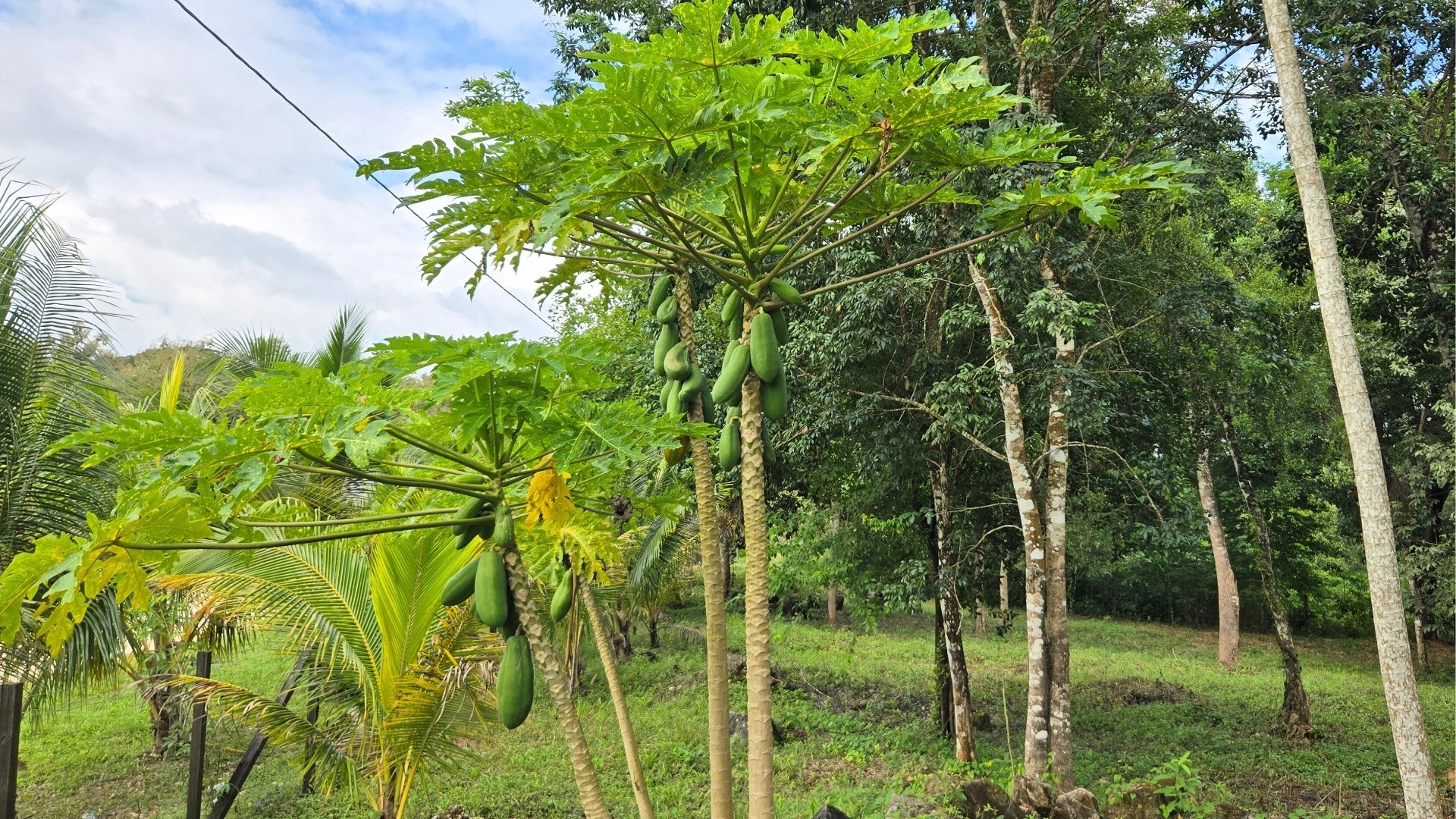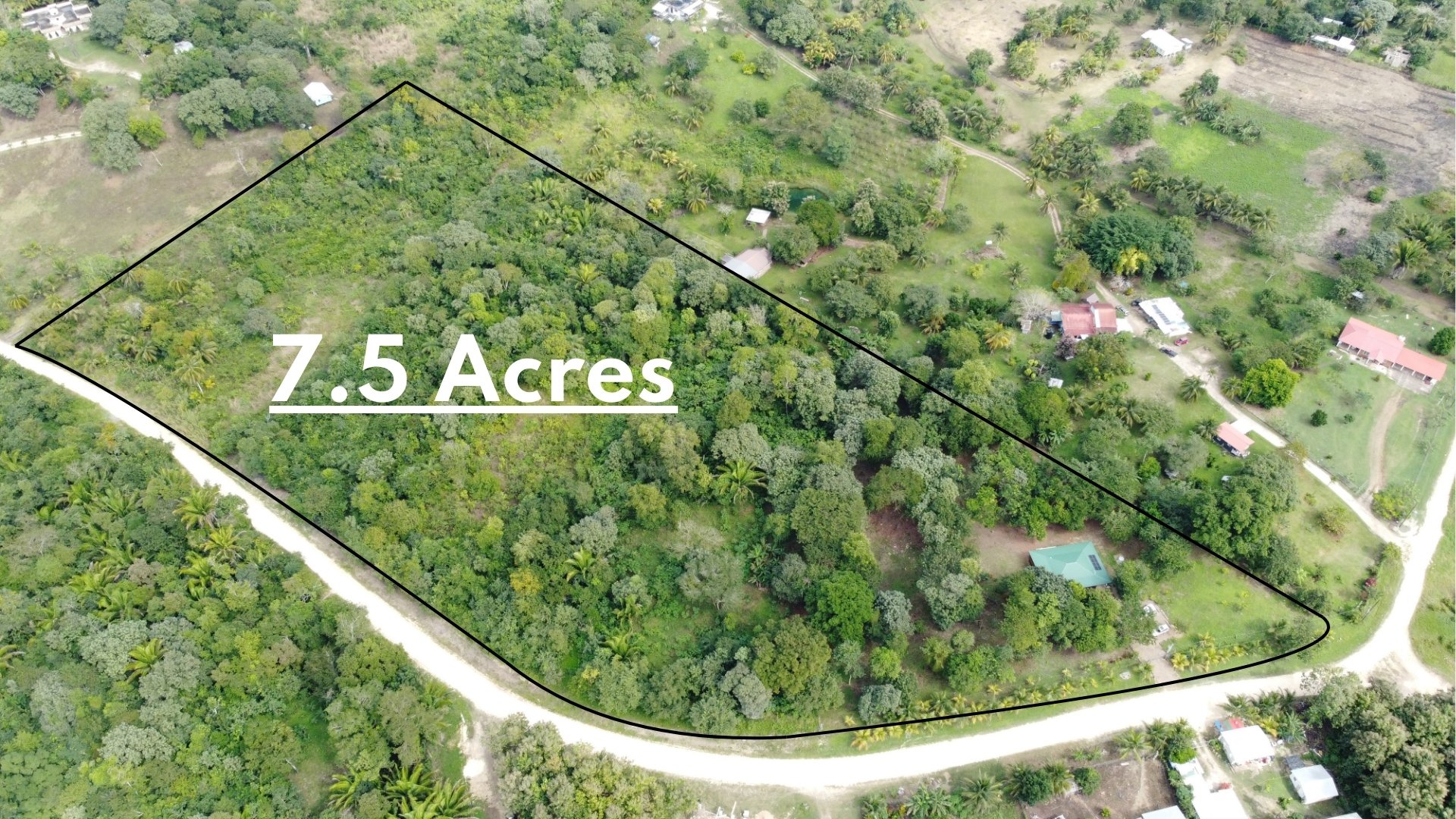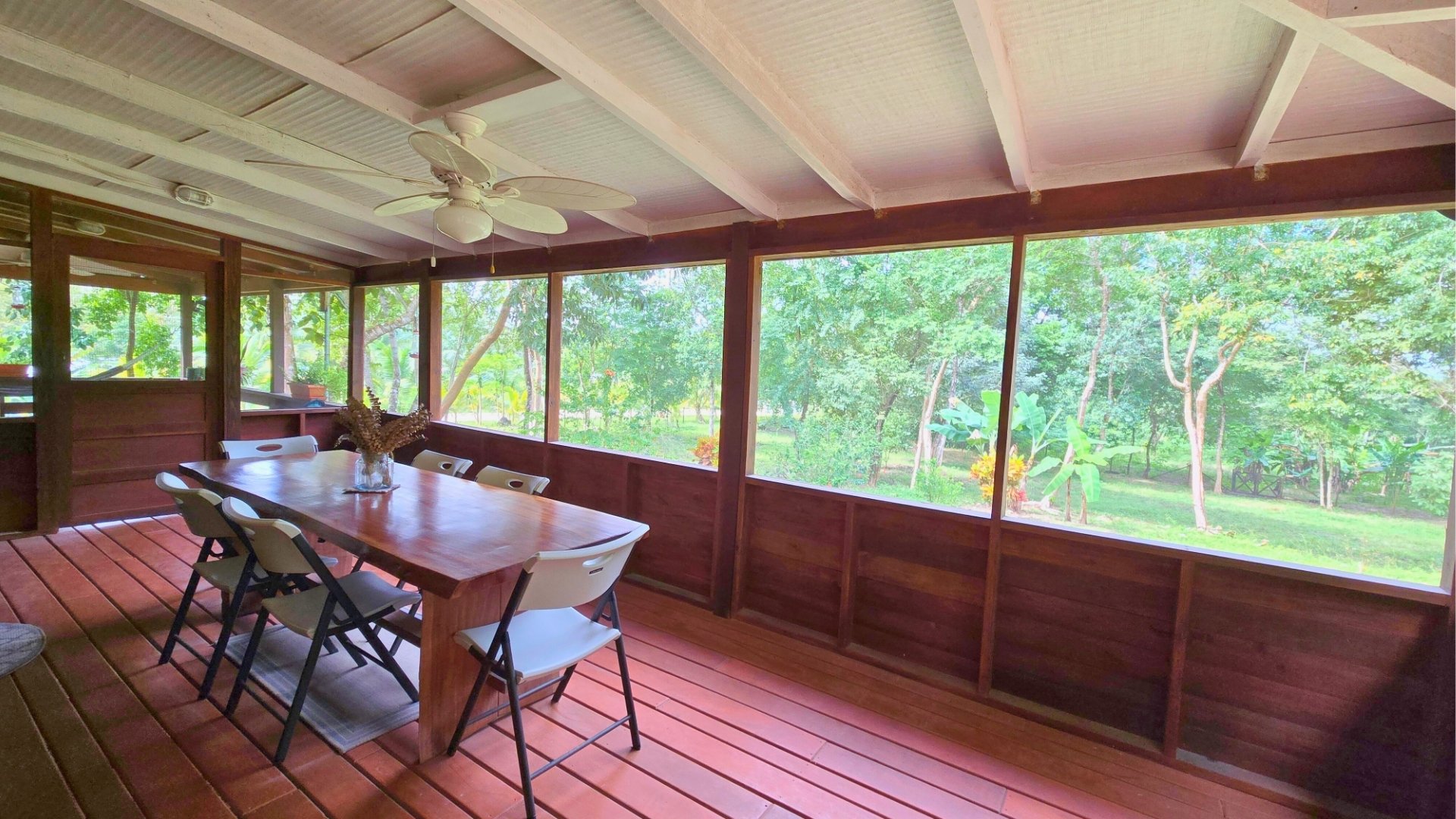 The land totals 7.5 acres, with 4 acres cleared and landscaped, featuring fruit trees including avocado, plantains, bananas, surnam cherry and more. The remaining 3.5 acres of jungle, with trails and a small hill, are ideal for future development of cabins, a retreat, or rental cottages.