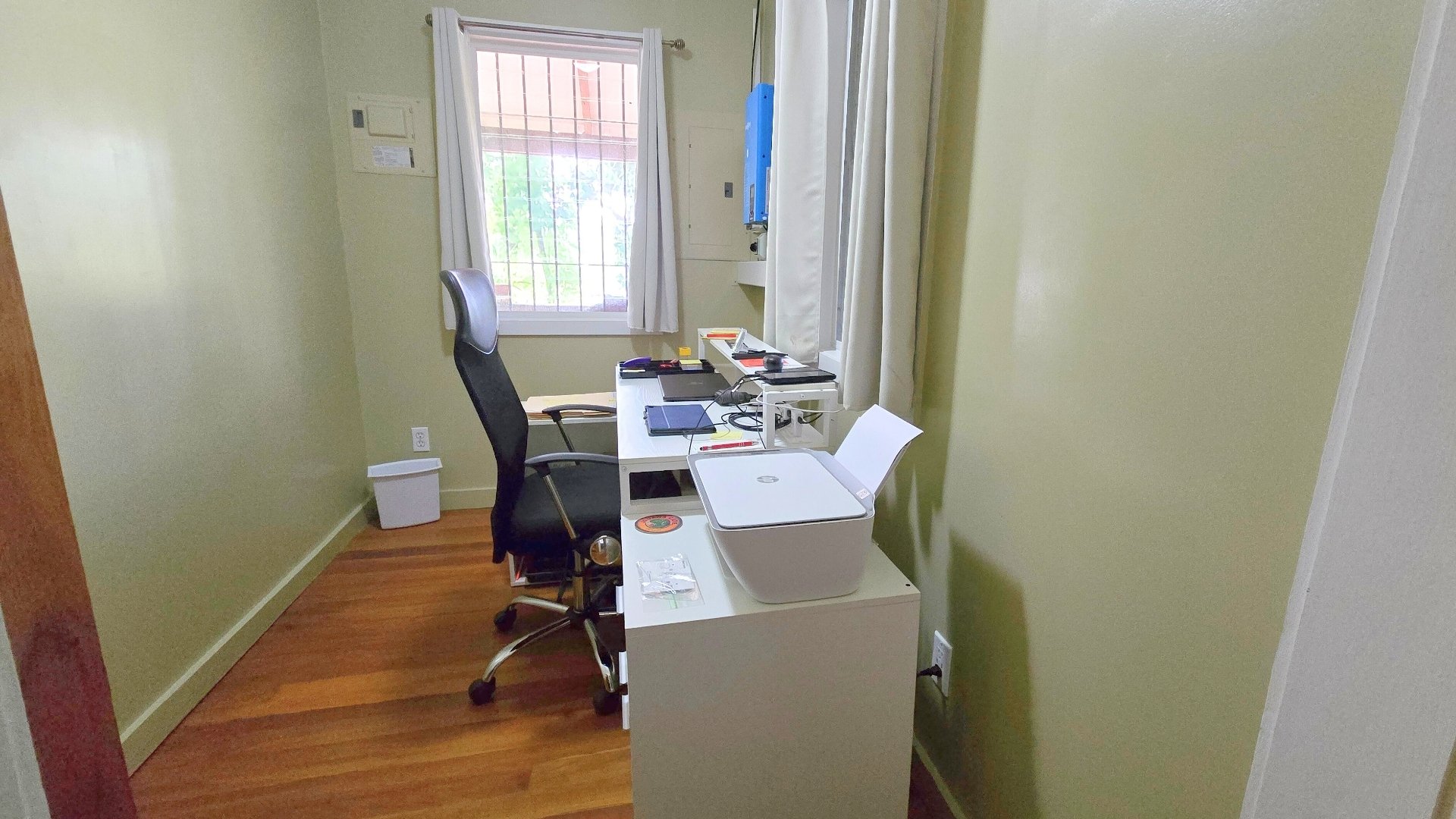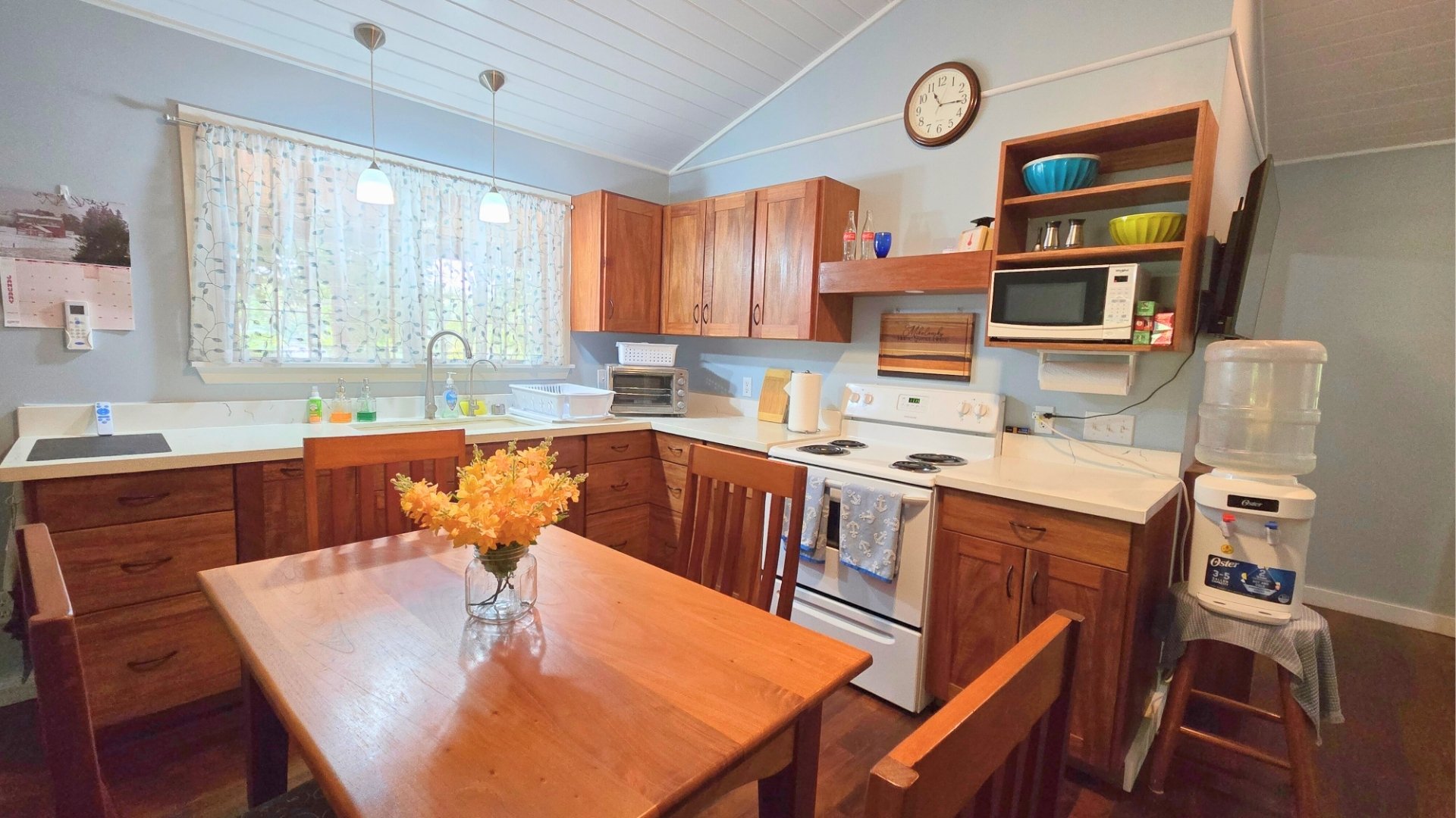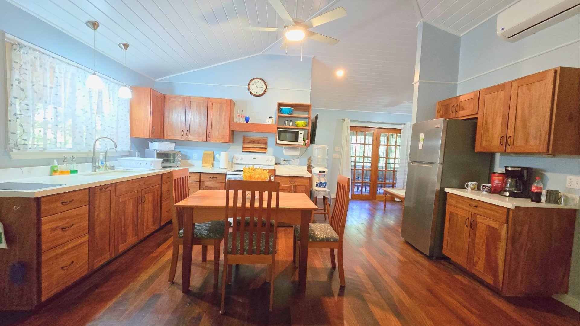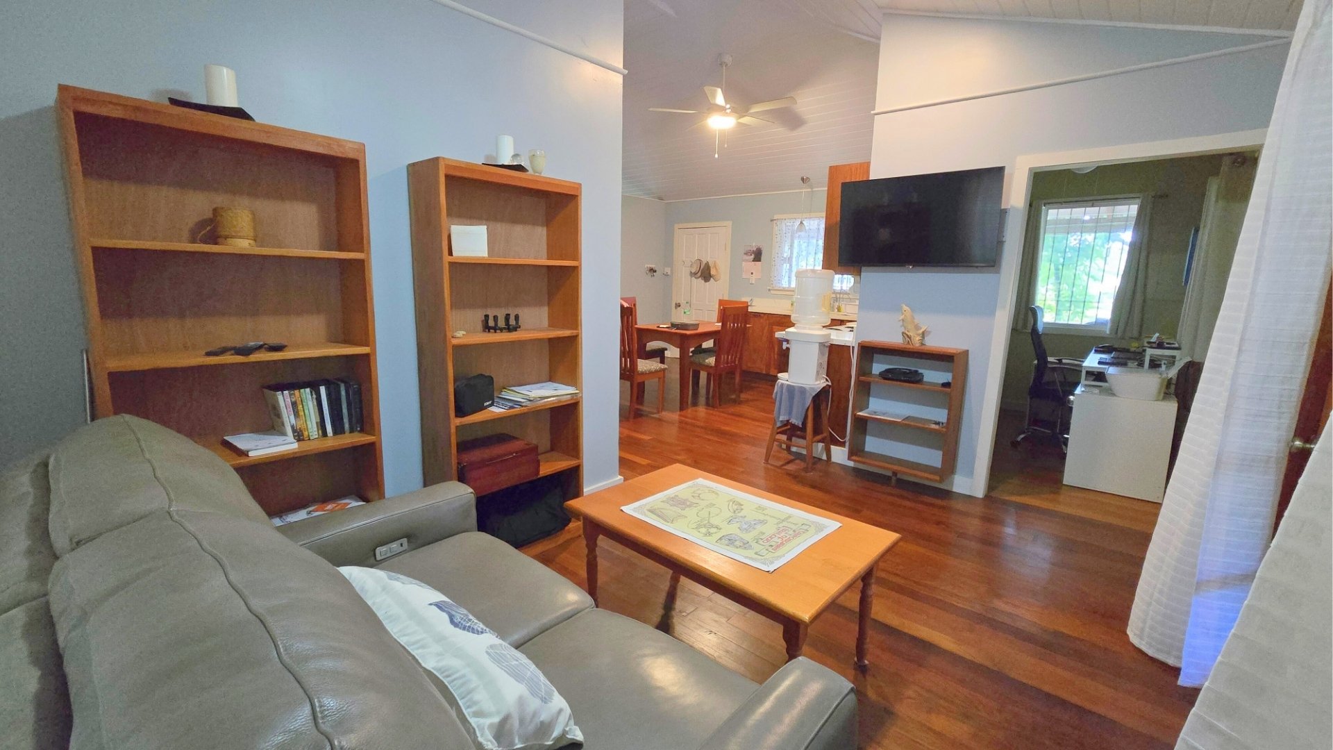 The home features exotic Belizean hardwood floors, vaulted ceilings, and an open kitchen with dining area, a separate living room/TV space, two spacious bedrooms with closets, a large bathroom, and a home office.