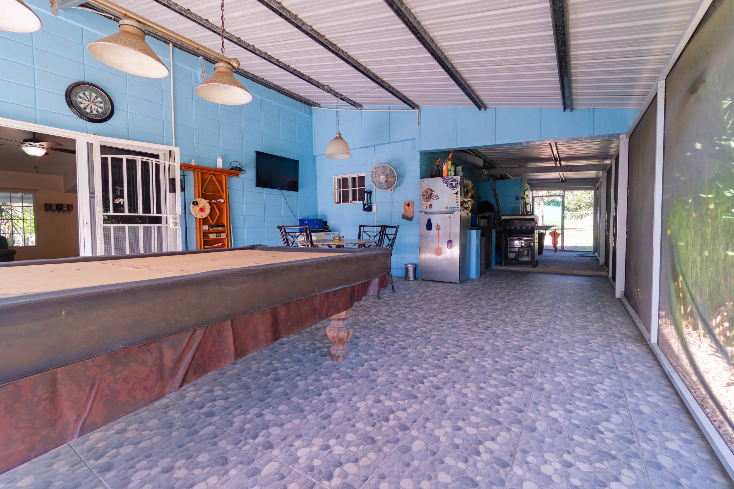 - Large screened back porch with a sink and billiards space